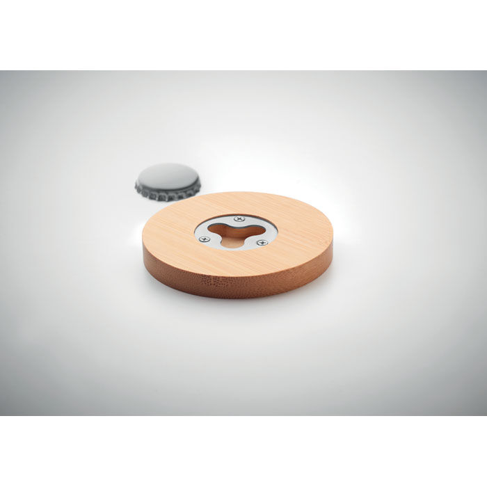 Kombinerad kapsylöppnare och drickunderlägg i Bambu. Bambu är en naturligt material och kan finnas små variationer i färg och storlek, vilket kan påverka märkningen.