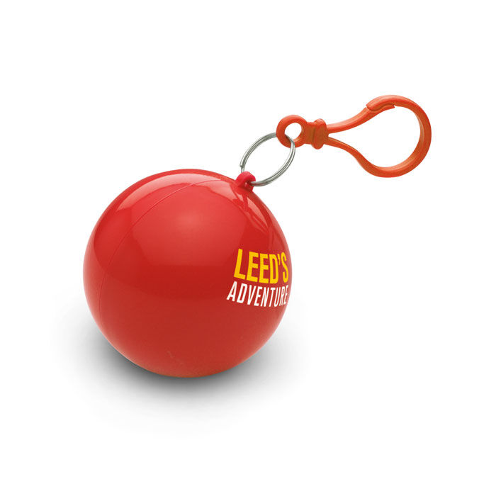 Transparent PE poncho i en boll i AS-plastskal med karbinhake att hänga på ett bälte eller en väska. Kan endast tryckas på plastbollen.