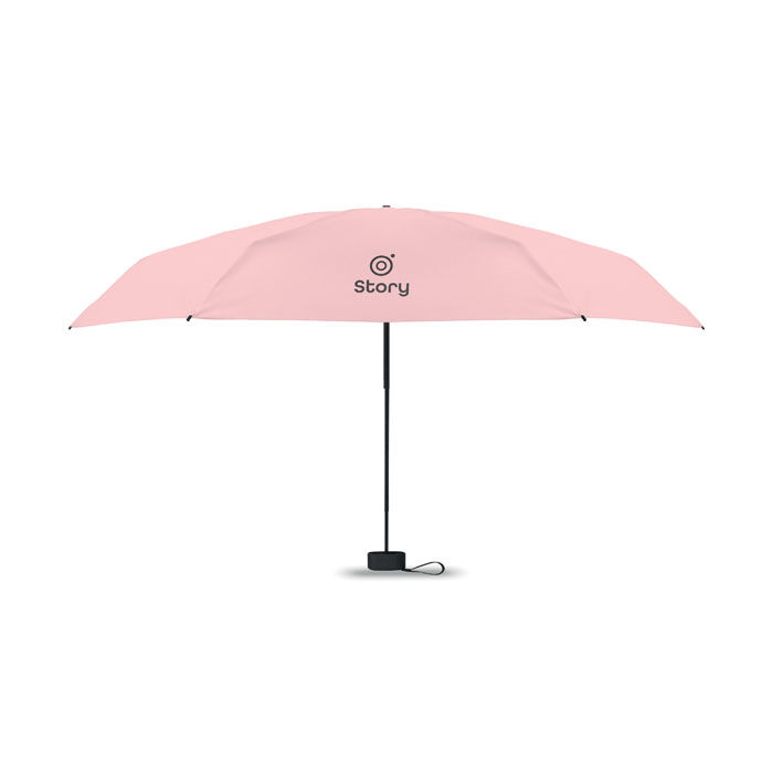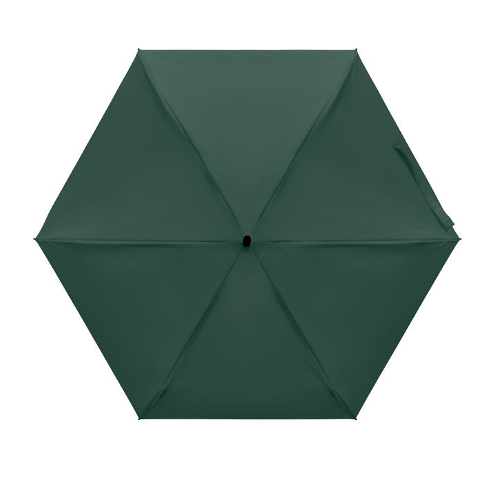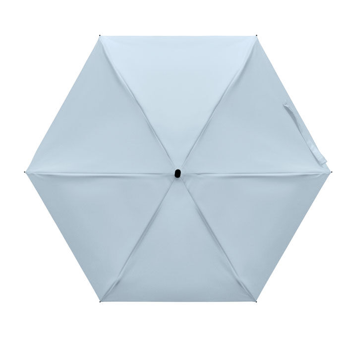 19-tums 5-faldigt manuellt paraply tillverkat av 190T pongee med påse. Det har en vindtät ram i metall och glasfiber, svart gummerat handtag med handledsrem och en kompakt hopfälld storlek på 17 cm.